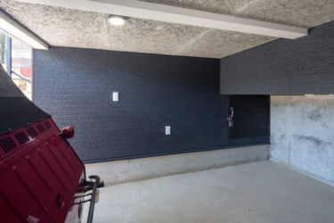敷地半分を掘削し道路と同じ高さに玄関を設け、更に駐車場を確保