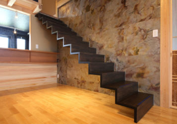 和風住宅には見られない片持ちのリビング階段は2階の隠れ家的な休憩場所へ