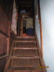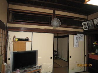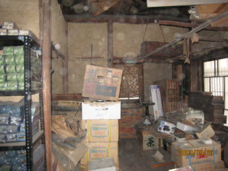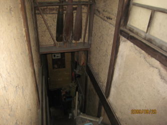 屋根は瓦(杉皮下葺き) 外、内壁は土壁、長年の地震や劣化で大きく傾いている