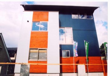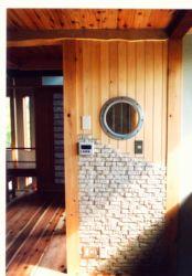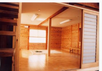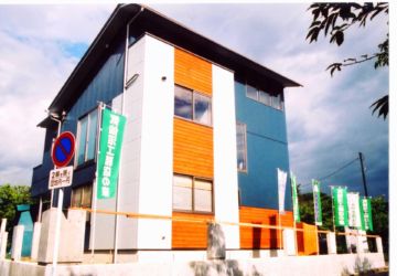 プレハブ小屋事務所の老朽化に当り、改築。外観はRを取り入れたモダンなデザインだが、中に入ると 入口ホール吹抜からは岩出山産の太い古材の小屋組みが見渡せ、古民家建築のイメージとは違う 丸窓や細窓がの入る光は室内を明るく照らす。