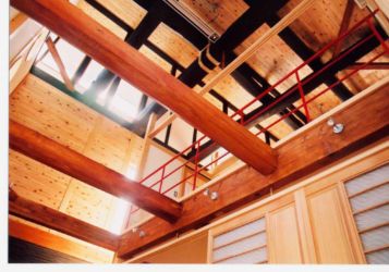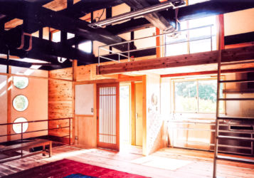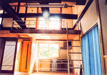 1階は事務所スペース、2階は休憩室だが、ロフト付きで水回りの設備も完備しているので生活が可能。また、手すり部には建具で間仕切りが可能。